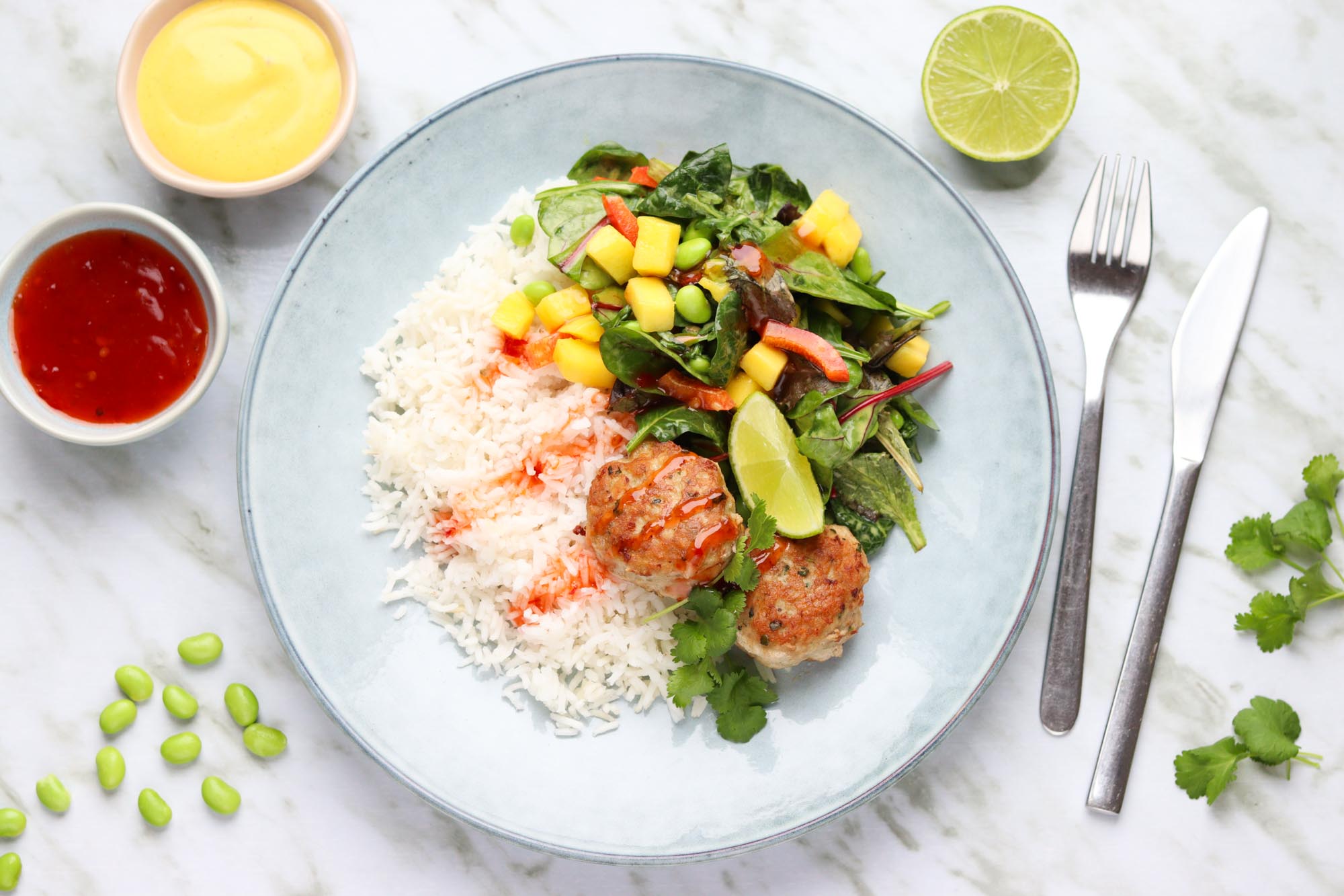 Smagfulde asiatiske frikadeller rørt med koriander, hvidløg og revet limeskal. Serveret med ris og en saftig mangosalat med rød peberfrugt, edamamebønner og karry- og mangodressing. God fornøjelse!