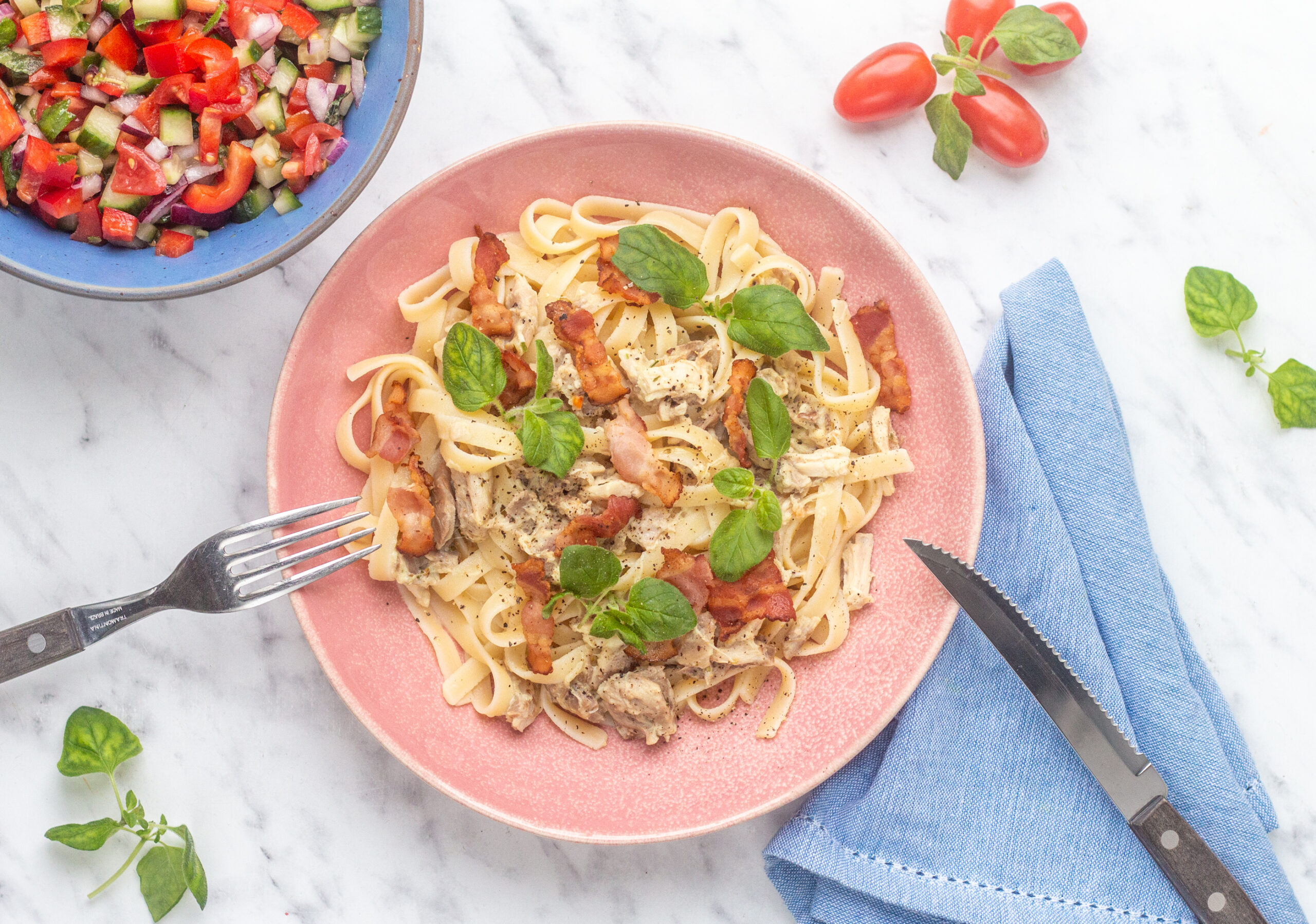 Nem og lækker spaghetti serveret med cremet kylling og sprødstegt bacon. Hertil serverer vi en sprød salat med cherrytomater, peberfrugt, agurk og rødløg. Velbekomme!