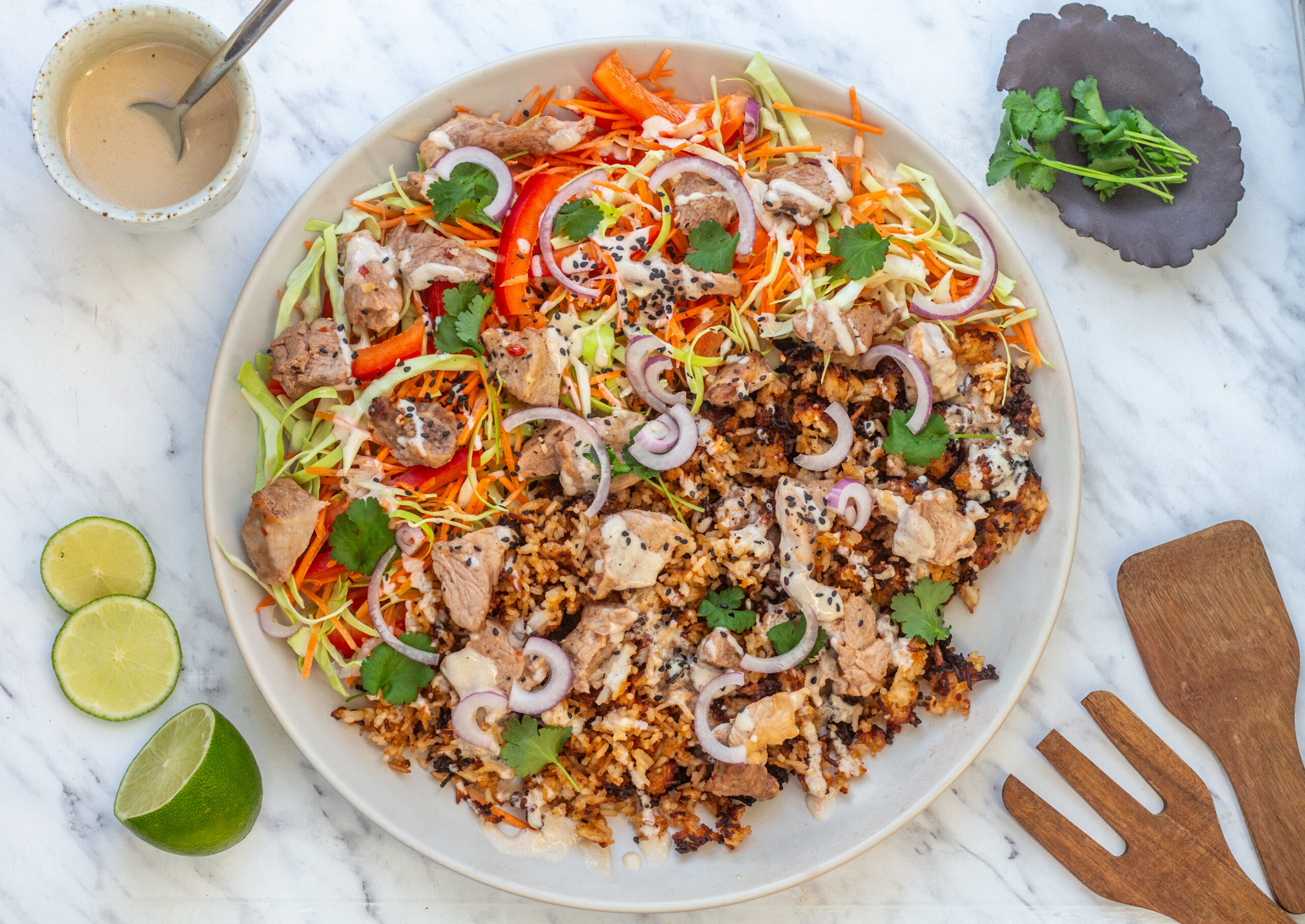 Har du nedkølede ris tilovers fra dagen før, er det fantastisk at lave dem til crispy ris! Her vender vi dem med stegt svinekød fra gårsdagens asiatisk inspirerede flæskesteg, salat og sesamdressing. God fornøjelse!