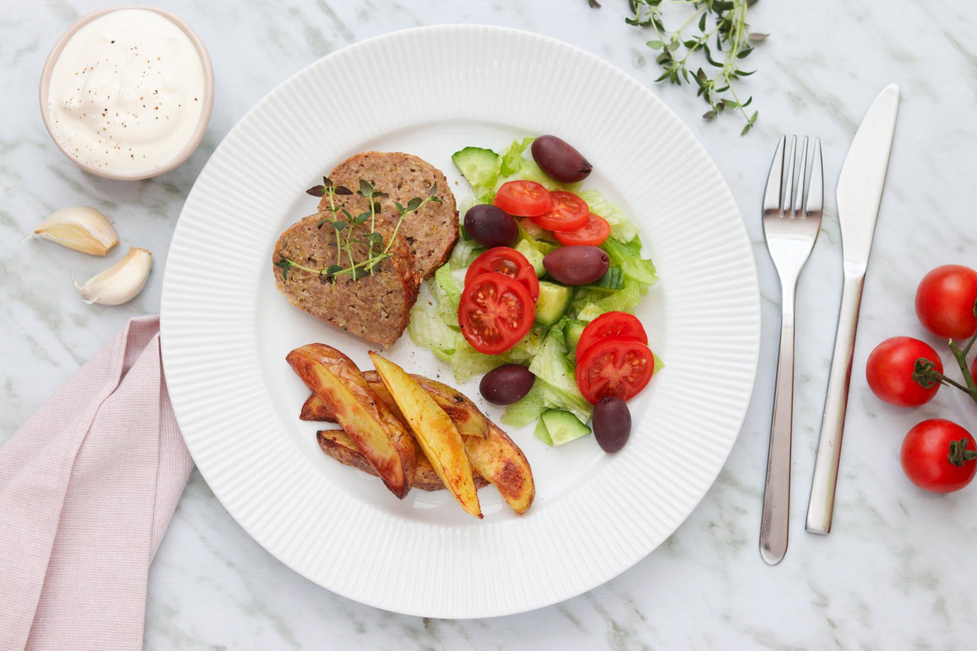 Nemt og lækkert farsbrød med svinekød og timian. Serveret med sprøde kartofler bagt i ovnen, en nem salat og en smagfuld hvidløgsdressing. God fornøjelse!
