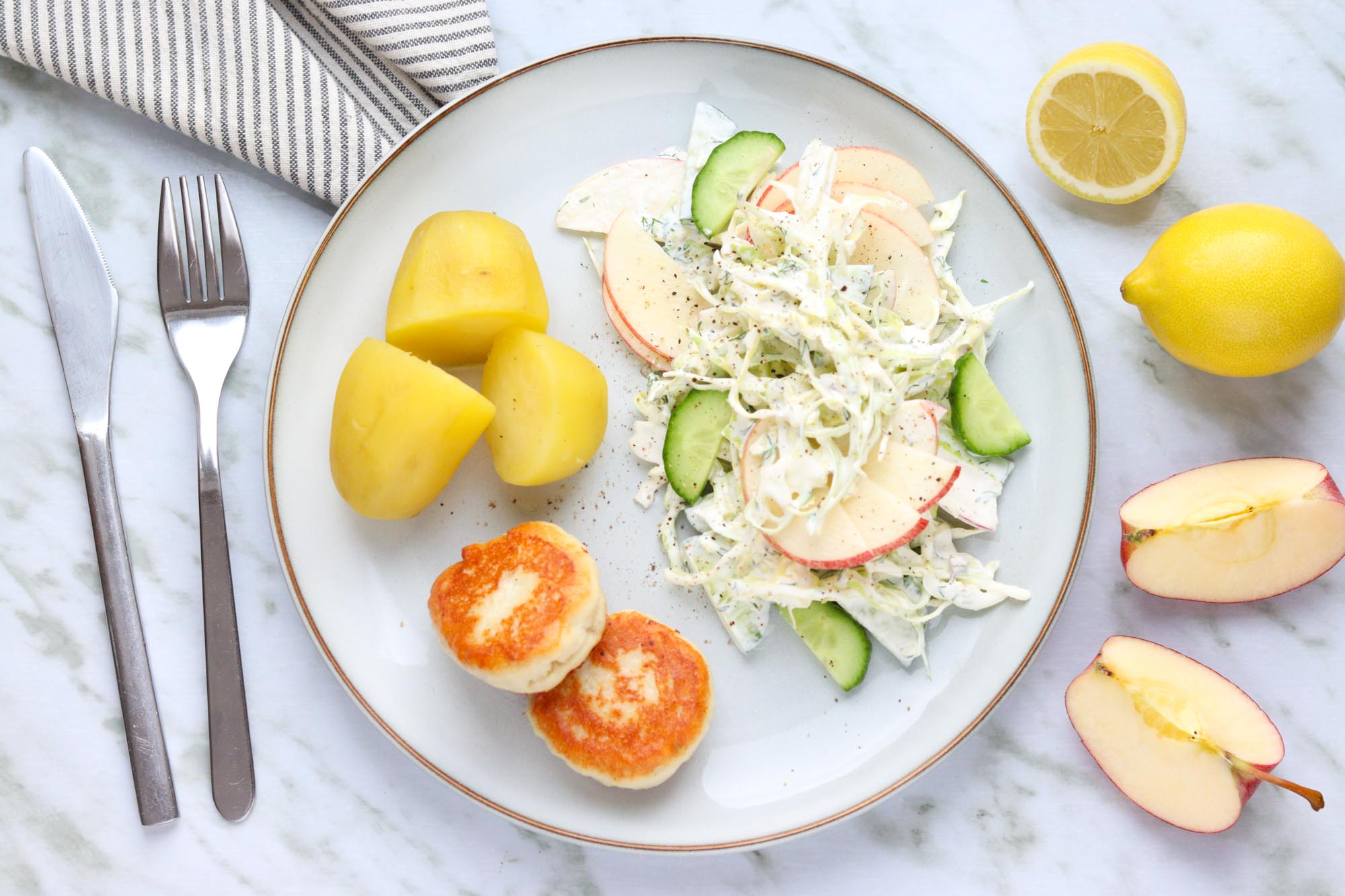 Her serverer vi lækre fiskedeller med kogte kartofler og en sprød spidskålsalat med æble og agurk vendt med en dressing af creme fraiche, mayonnaise, dild, kapers og citronsaft. God fornøjelse!