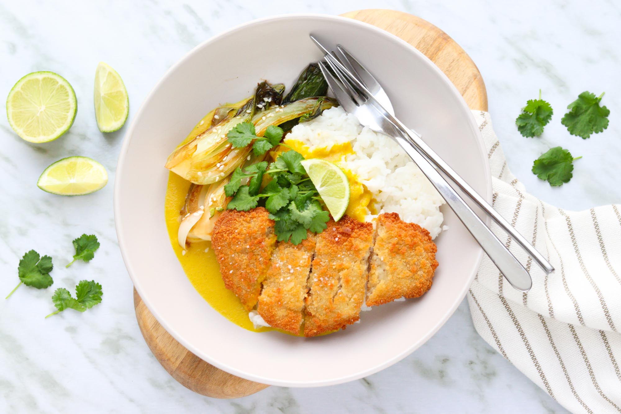 Her serverer vi en asiatiskinspireret ret med færdigpanerede fiskefileter, karrysovs med masser af grøntsager og kokosmælk og pak choi stegt i teriyakisauce. God fornøjelse!