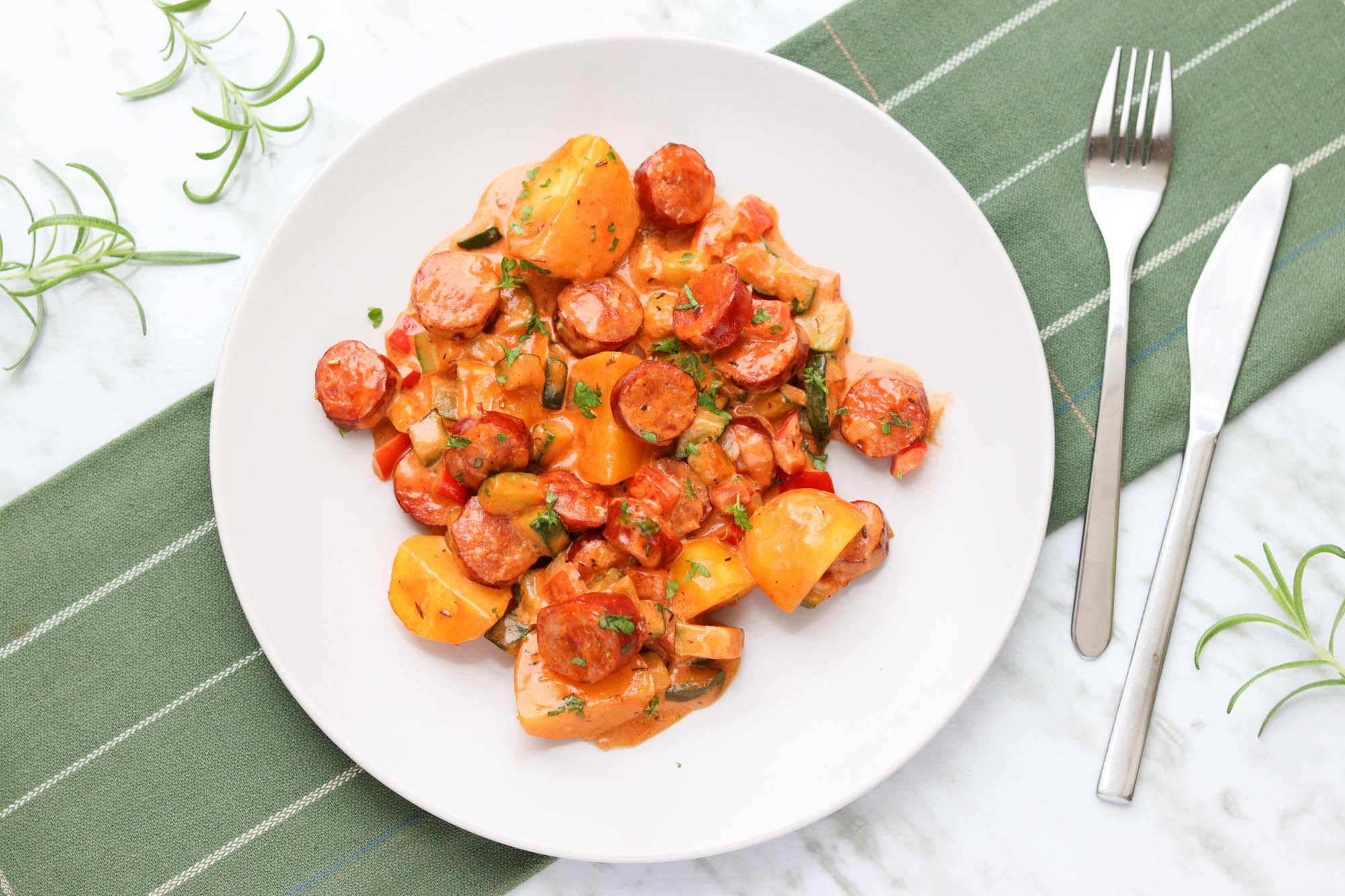 En lækker og smagfuld pølseret med et fransk touch. Vi har brugt kålpølser, squash, peberfrugt og kartofler vendt i en sovs af fløde, tomatpuré, timian, rosmarin og paprika. God fornøjelse!