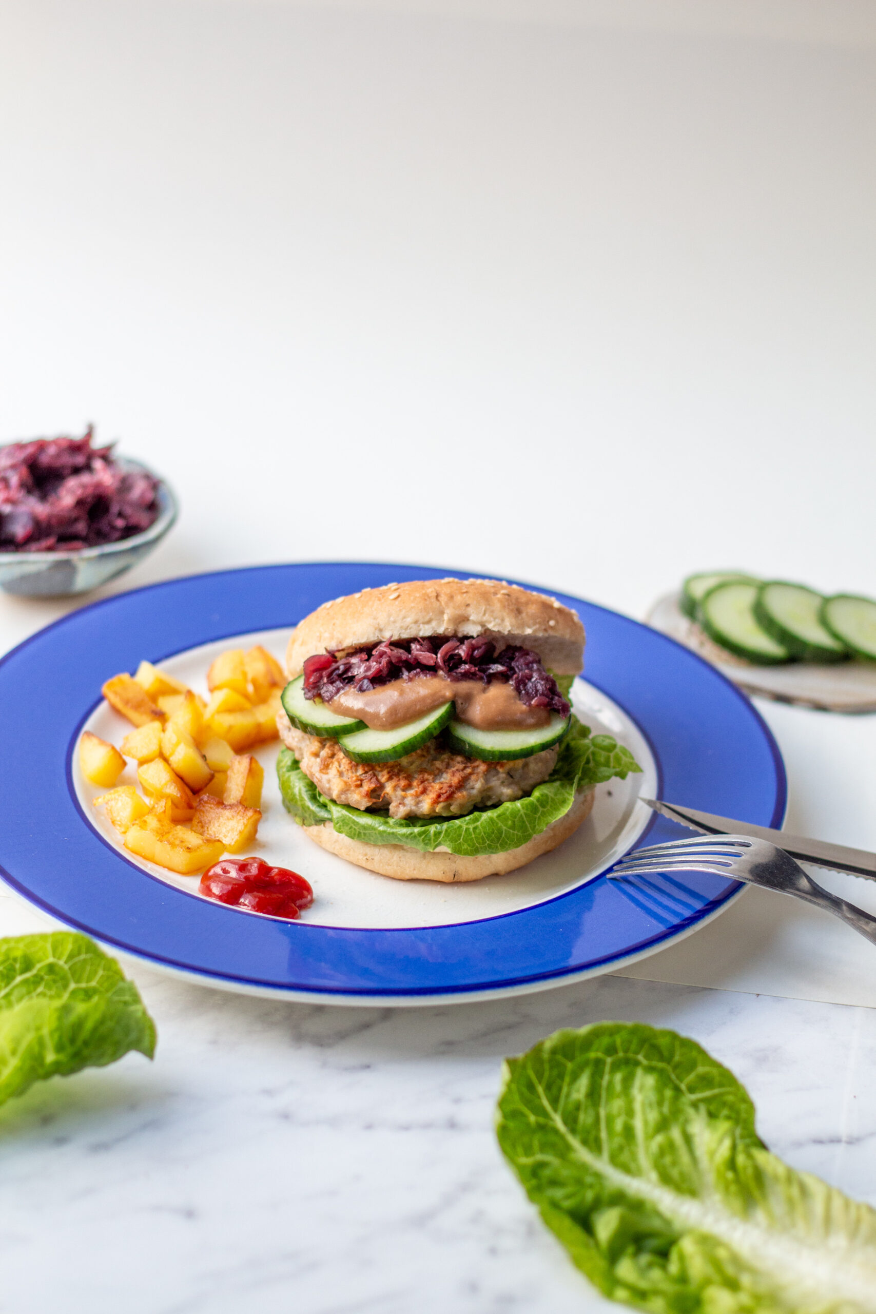 Lækre frikadelleburgere med resterne fra gårsdagens deller, kartofler, rødkål og brun sauce, som serveres med stegte kartofler. God fornøjelse!