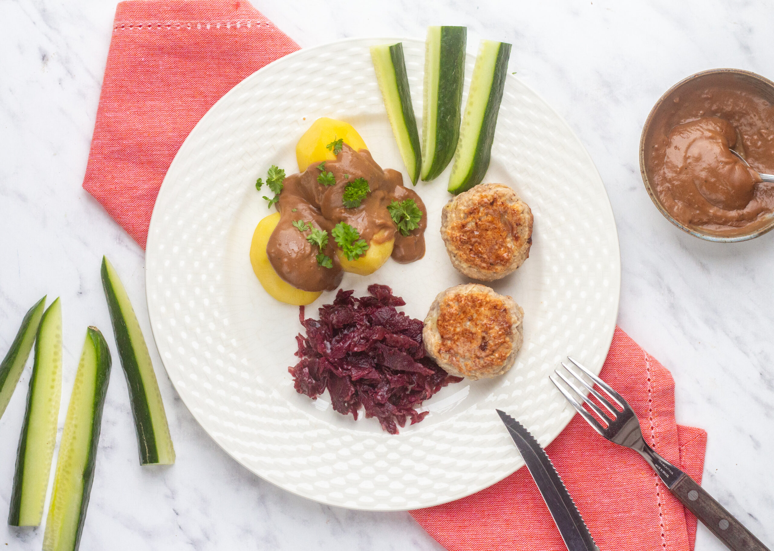 Lækre klassiske frikadeller som vi bager i ovnen og serverer med kogte kartofler, brun sauce, rødkål og agurk i stave. Opskriften er beregnet til to dage, så husk at gemme halvdelen til varmemad eller lækre frikadelleburgere i morgen. God fornøjelse!