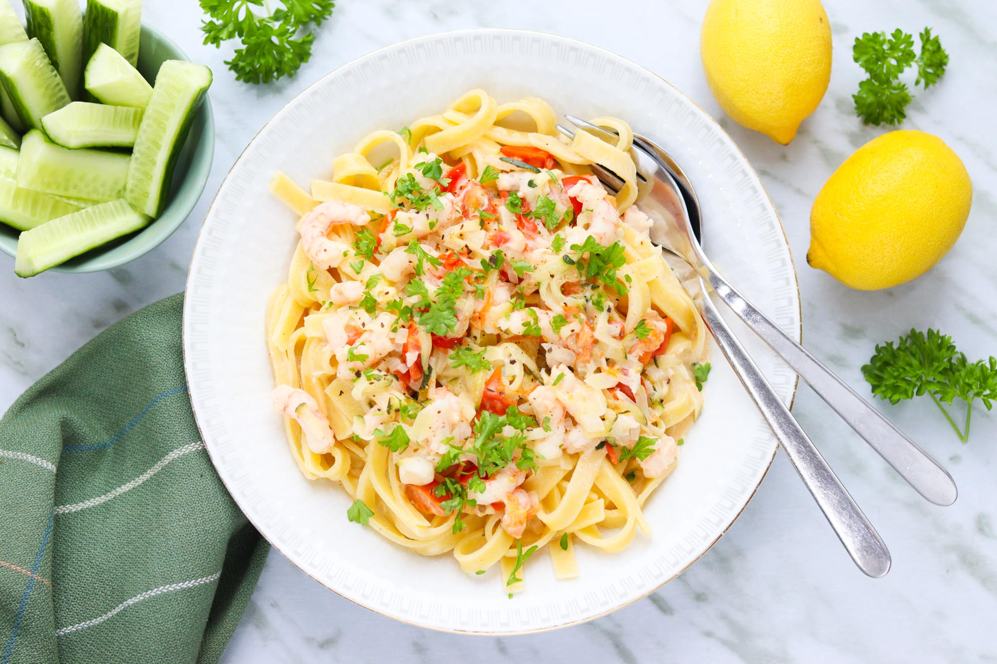 En lækker og simpel pastaret med en sauce af cremefine, rejer, masser af hvidløg, cherrytomater, squash og citron. God fornøjelse!