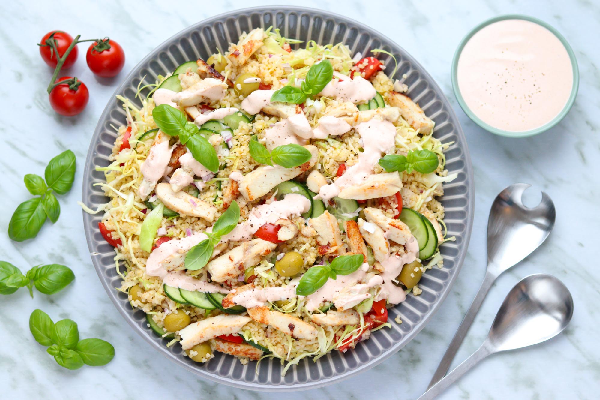 En lækker og fyldig bulgursalat med kylling, spidskål, tomater, agurk og oliven. Vi serverer bulgursalaten med en simpel paprikadressing som tilbehør. God fornøjelse!