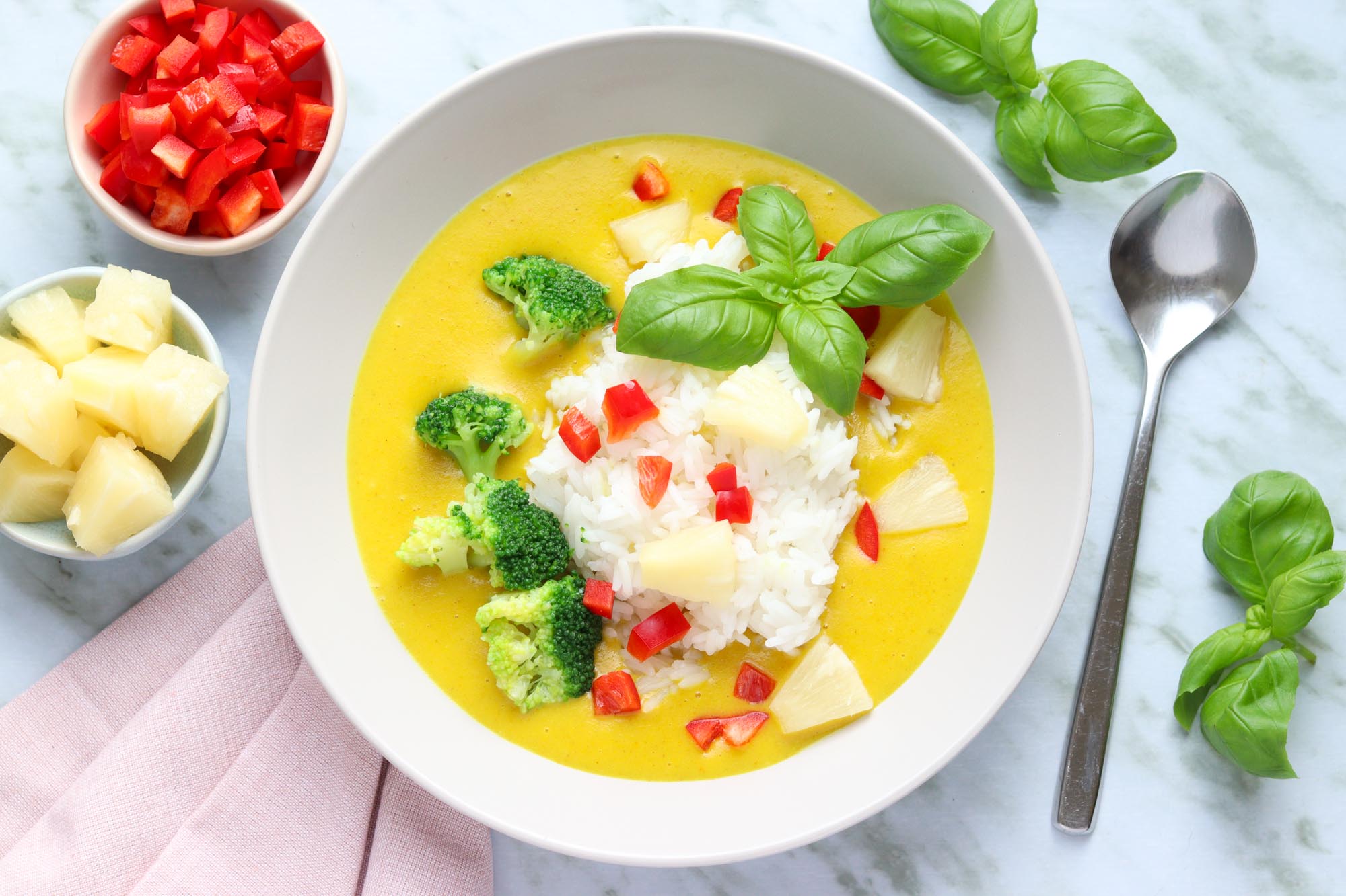 En lækker og fyldig karrysuppe med kartofler, porre, gulerødder og kokosmælk toppet med ananas, dampet broccoli, peberfrugt og ris. God fornøjelse!