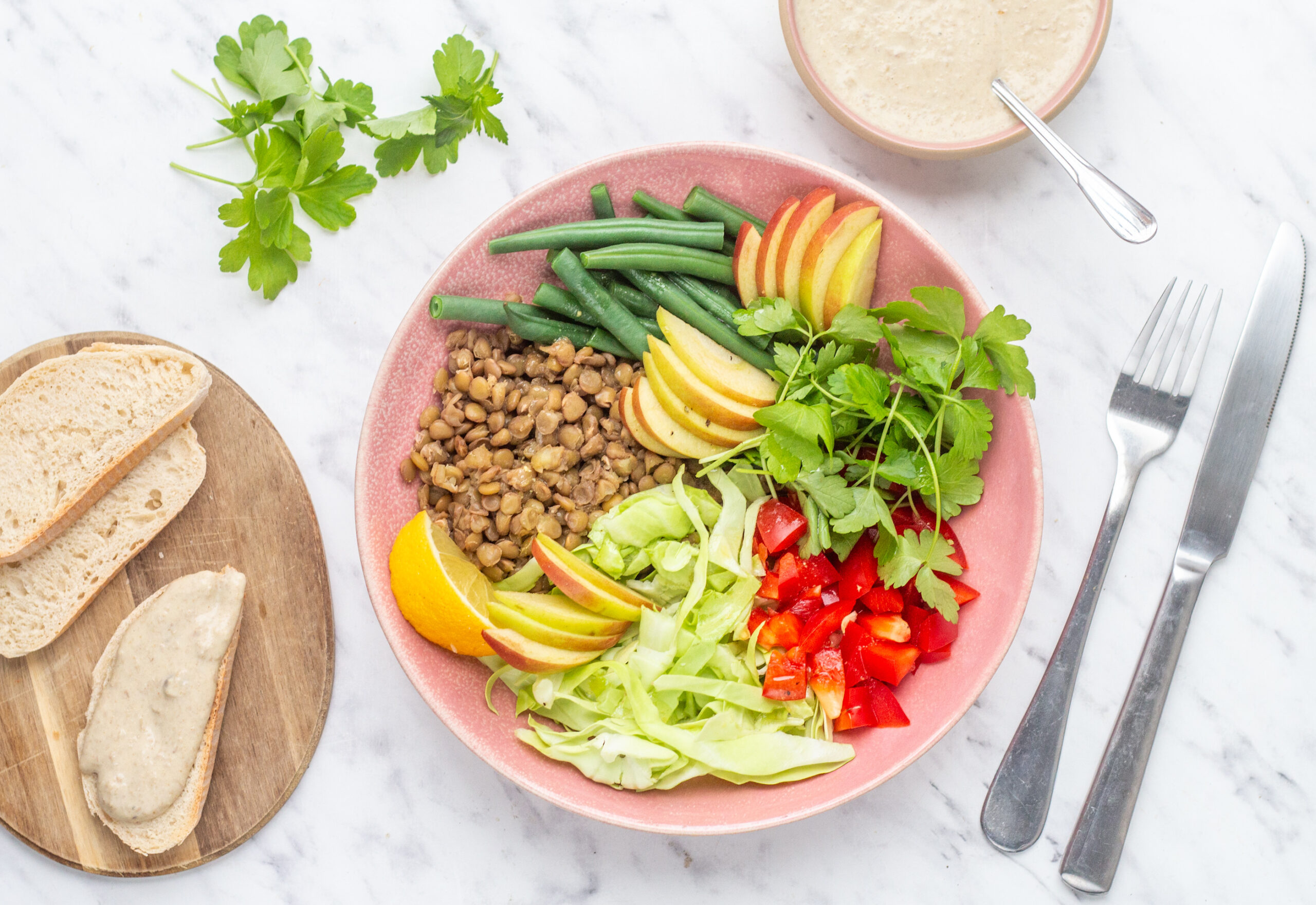 Fyldig proteinsalat med linser og sprøde grøntsager. Hertil brød og hummus.