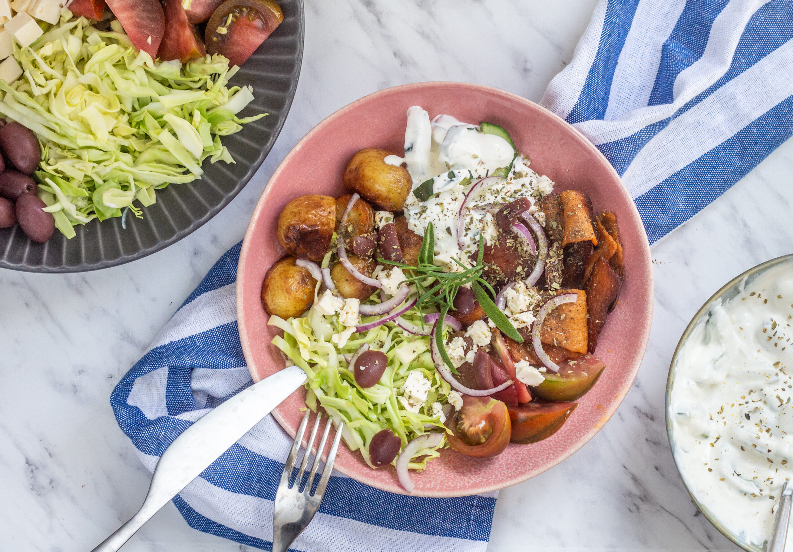 En smagfuld græskinspireret gyrosbowl med stegte kartofler, salat, oliven, salatost og en lækker chunky dressing med agurk som tilbehør. God fornøjelse!