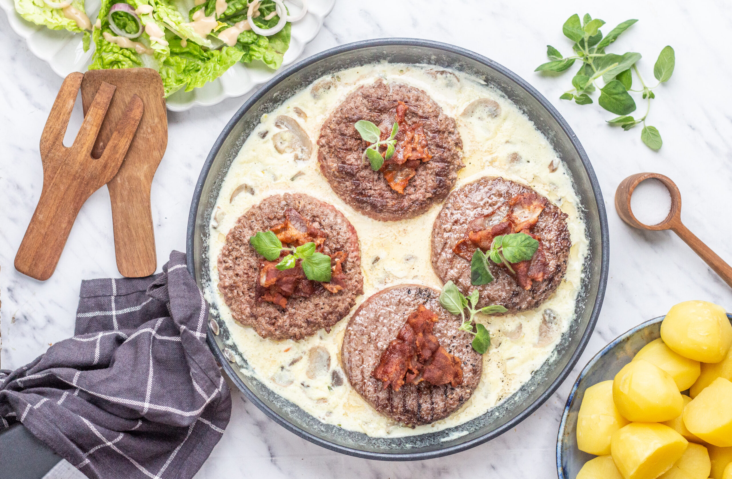 Lækre hakkebøffer med sprød bacon på toppen som vi serverer i en cremet svampesauce. Hertil kartofler og sprød salat. God fornøjelse!