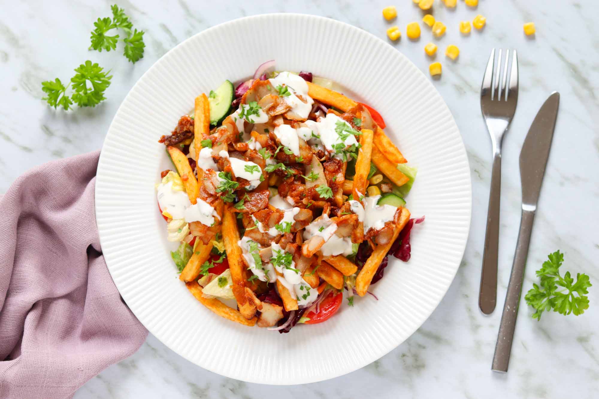 En kæmpe børnefavorit! Kebabret med sprød salat, agurk, tomater, majs, fritter og, selvfølgelig, creme fraiche dressing på toppen. Velbekomme!