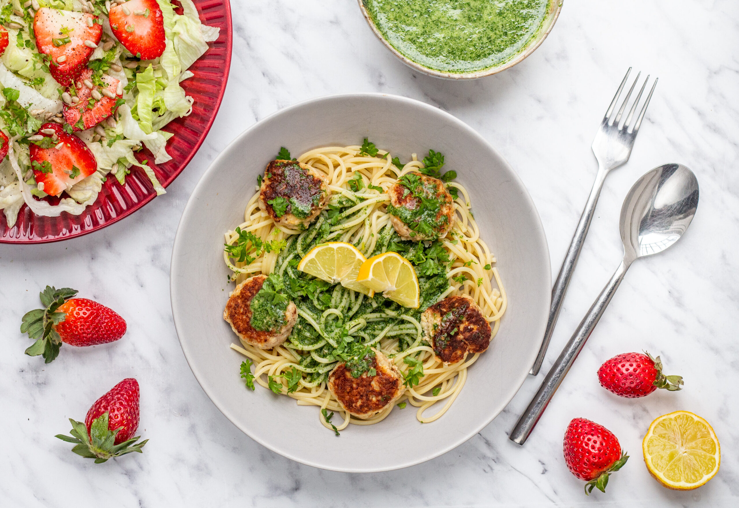 Det bliver ekstra nemt i dag, da du skal bruge resten af kødbollerne fra i går. Vi server dem med pasta, en hurtig hjemmerørt pesto og en sprød jordbærsalat. God fornøjelse!