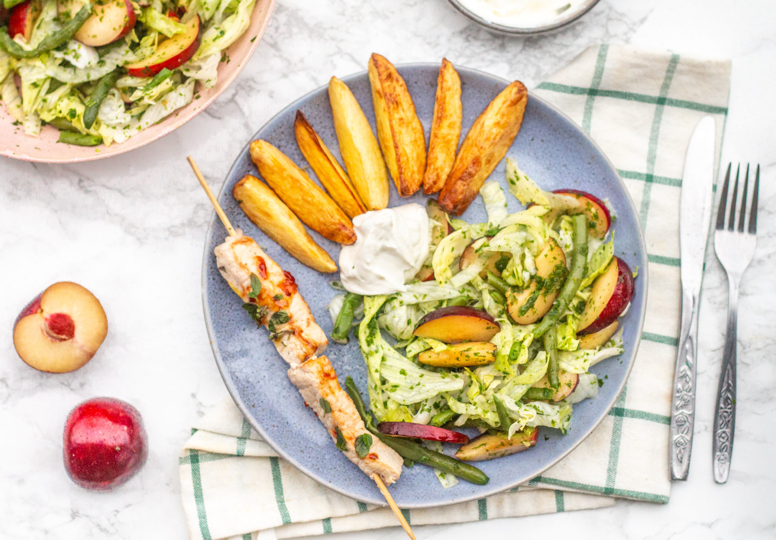Her har vi lavet lækre spyd med marinerede koteletter og serveret dem med ovnstegte kartofler og en sprød blommesalat med bønner og hvidløgsdressing. God fornøjelse!