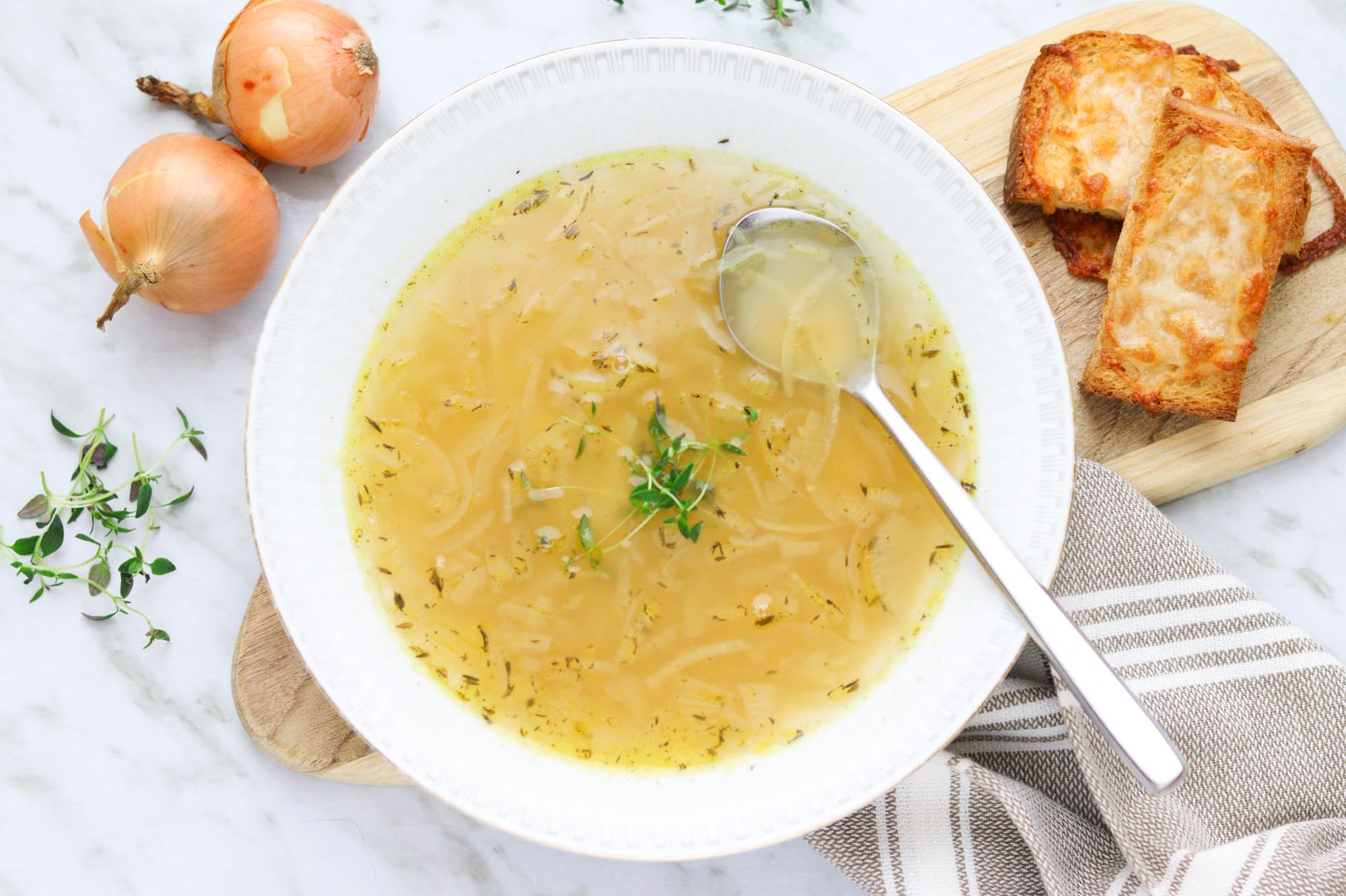 Her serverer vi hurtig og nem omgang løgsuppe med ostegratineret brød som tilbehør. God fornøjelse!