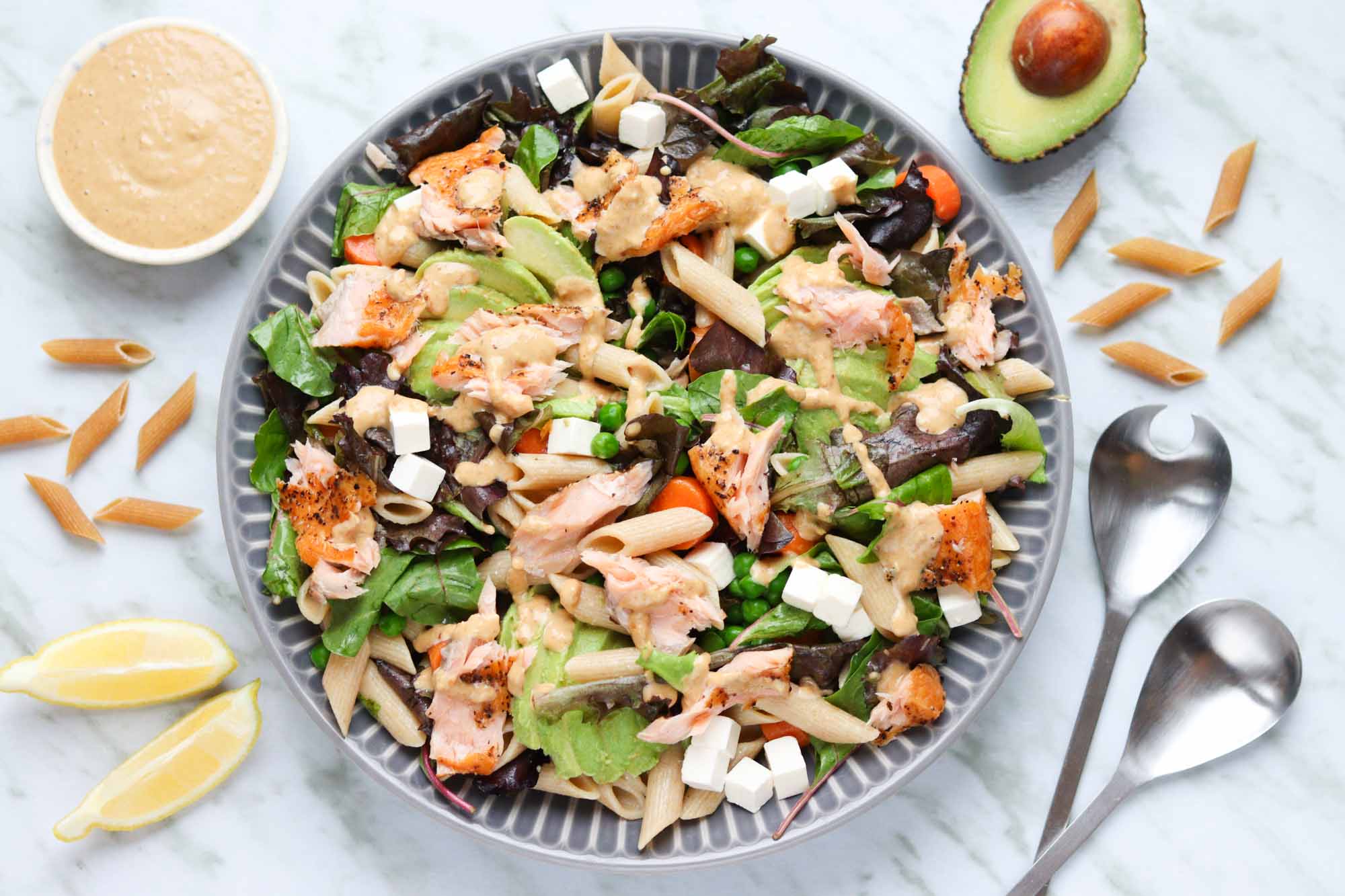 Måltidssalat med pasta, varmrøget laks og salatost. Hertil gomadressing.