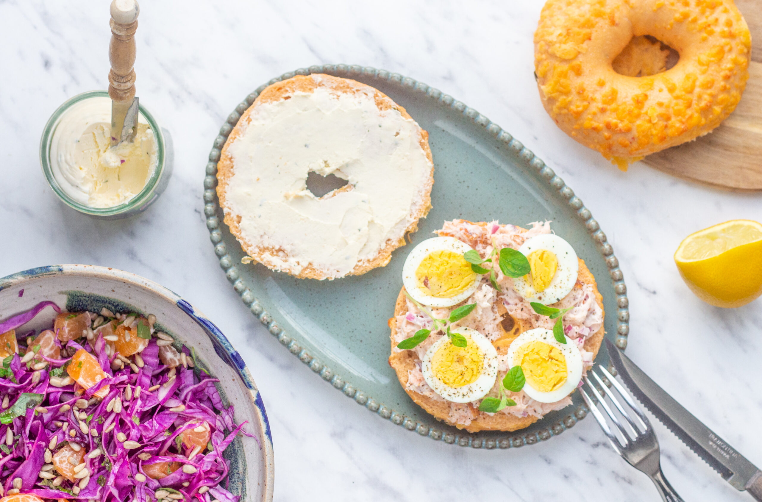 Lækre bagels med laksesalat, æg og smøreost med hvidløg. Vi serverer de lune bagels med en sprød salat med clementiner og ristede solsikkekerner som tilbehør. God fornøjelse!