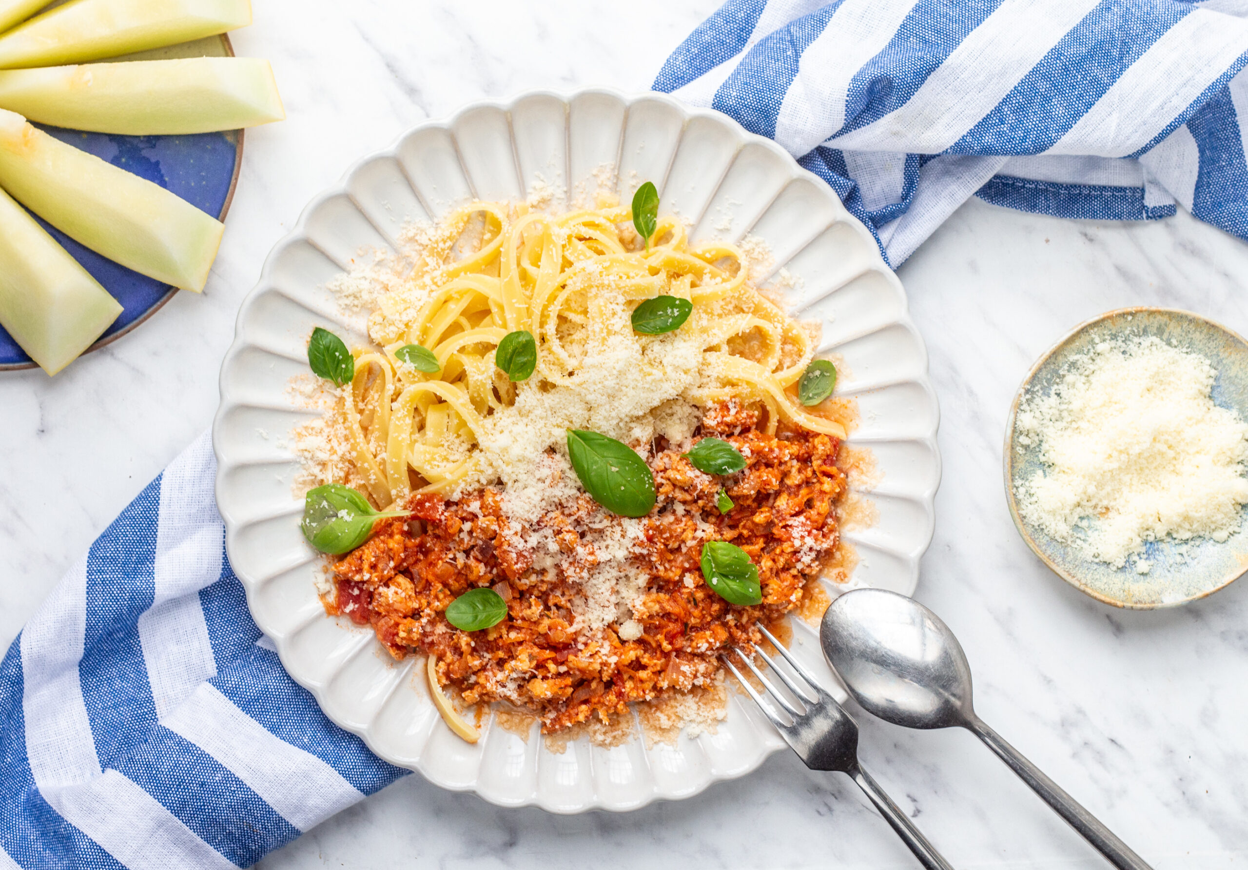 Server den friske pasta toppet med kødsauce, revet parmesan og melon som tilbehør. Velbekomme!Tip