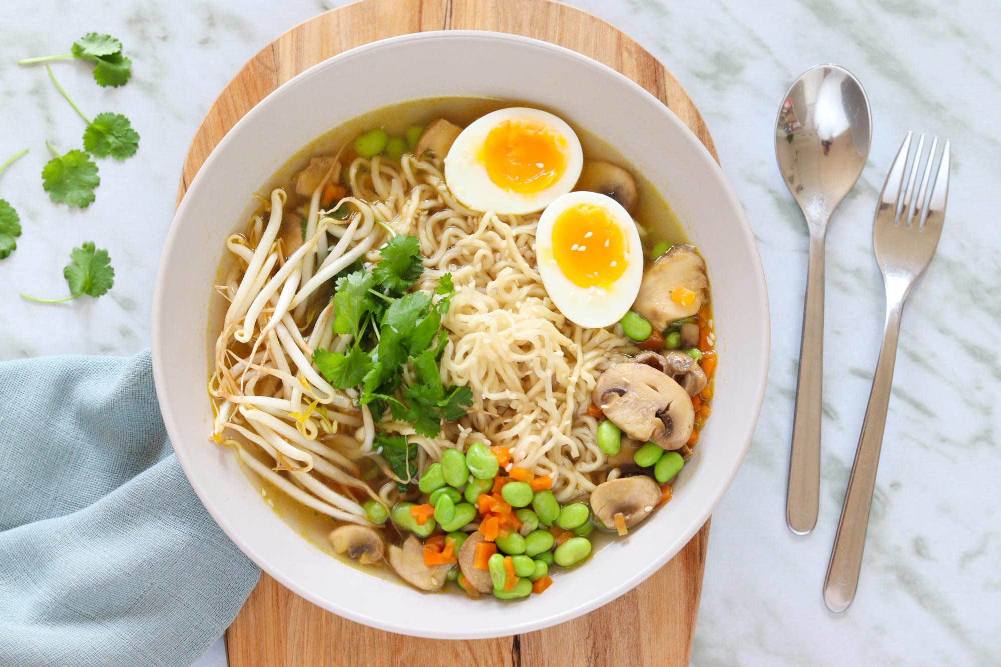 6 Server ramensuppen i skåle med nudler, grøntsager og smilende æg på toppen. Top evt. med friske koriander eller andre krydderurter, hvis du har dem på lager. Velbekomme!