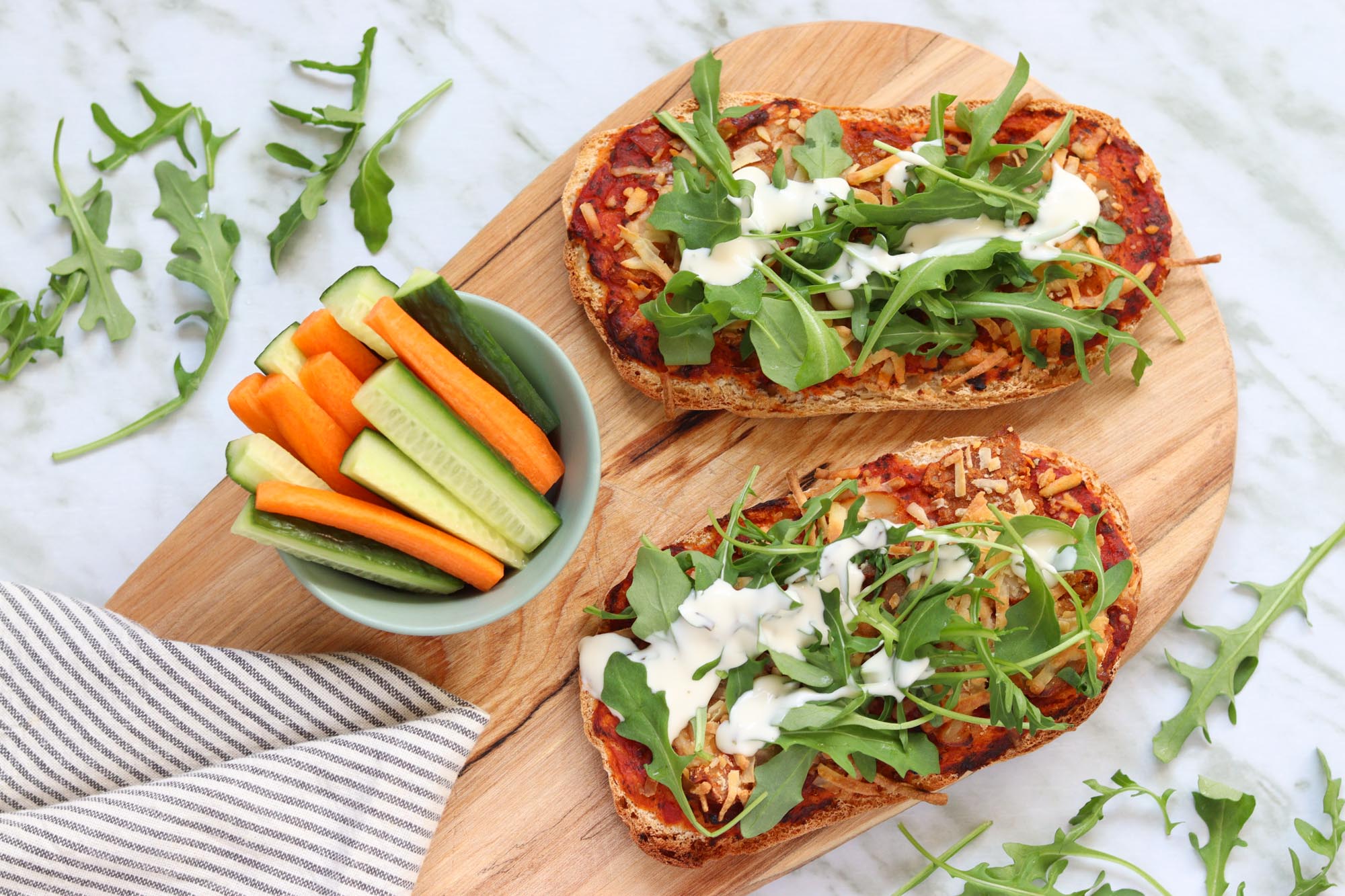 5 Top minipizzaerne med rucola og dressing og server med gnavegrønt som tilbehør. Velbekomme!
