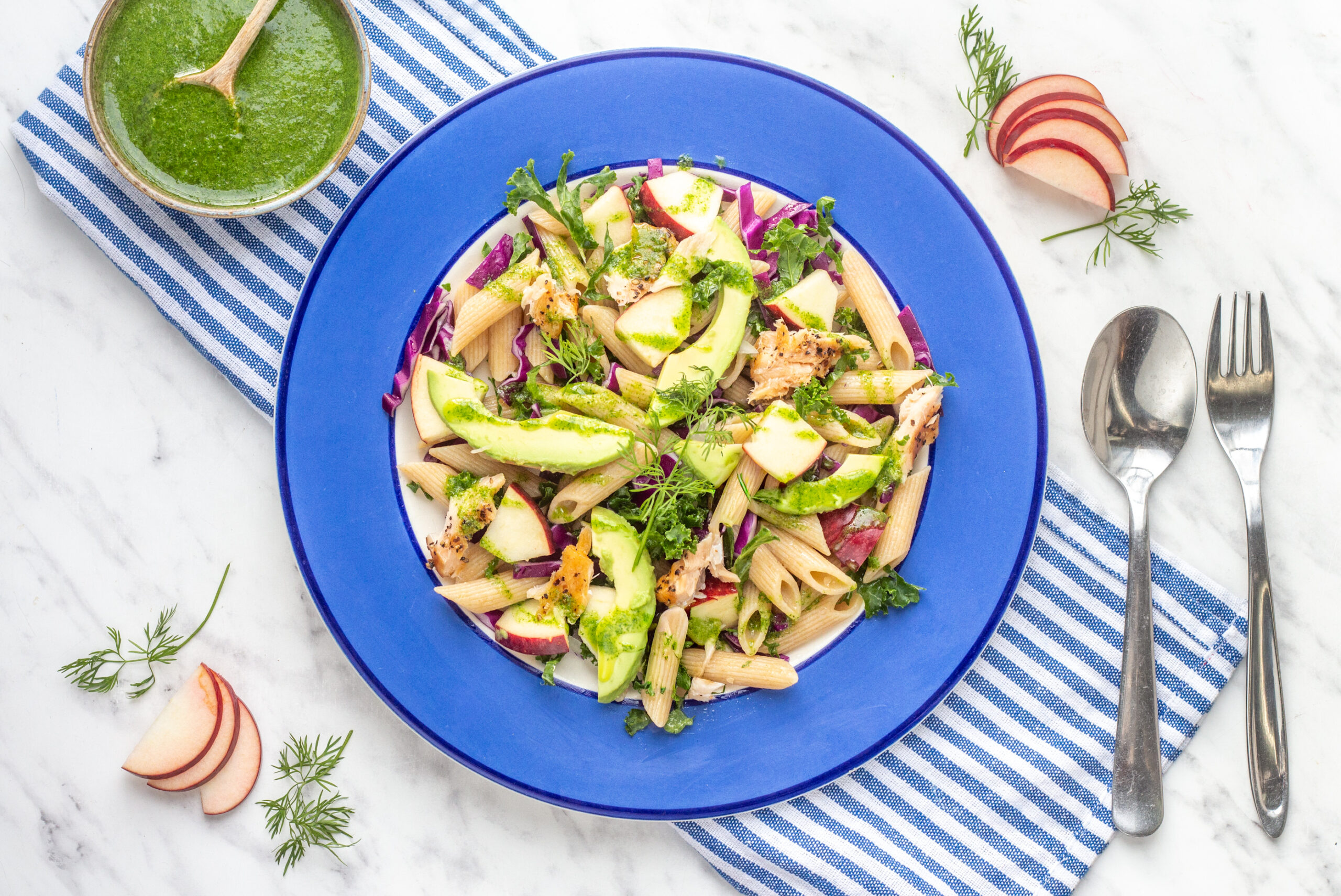 En hurtig og lækker pastasalat med avocado, æbler, kålsalat og varmrøget laks. Pastasalaten toppes med hjemmelavet dildolie. God fornøjelse!