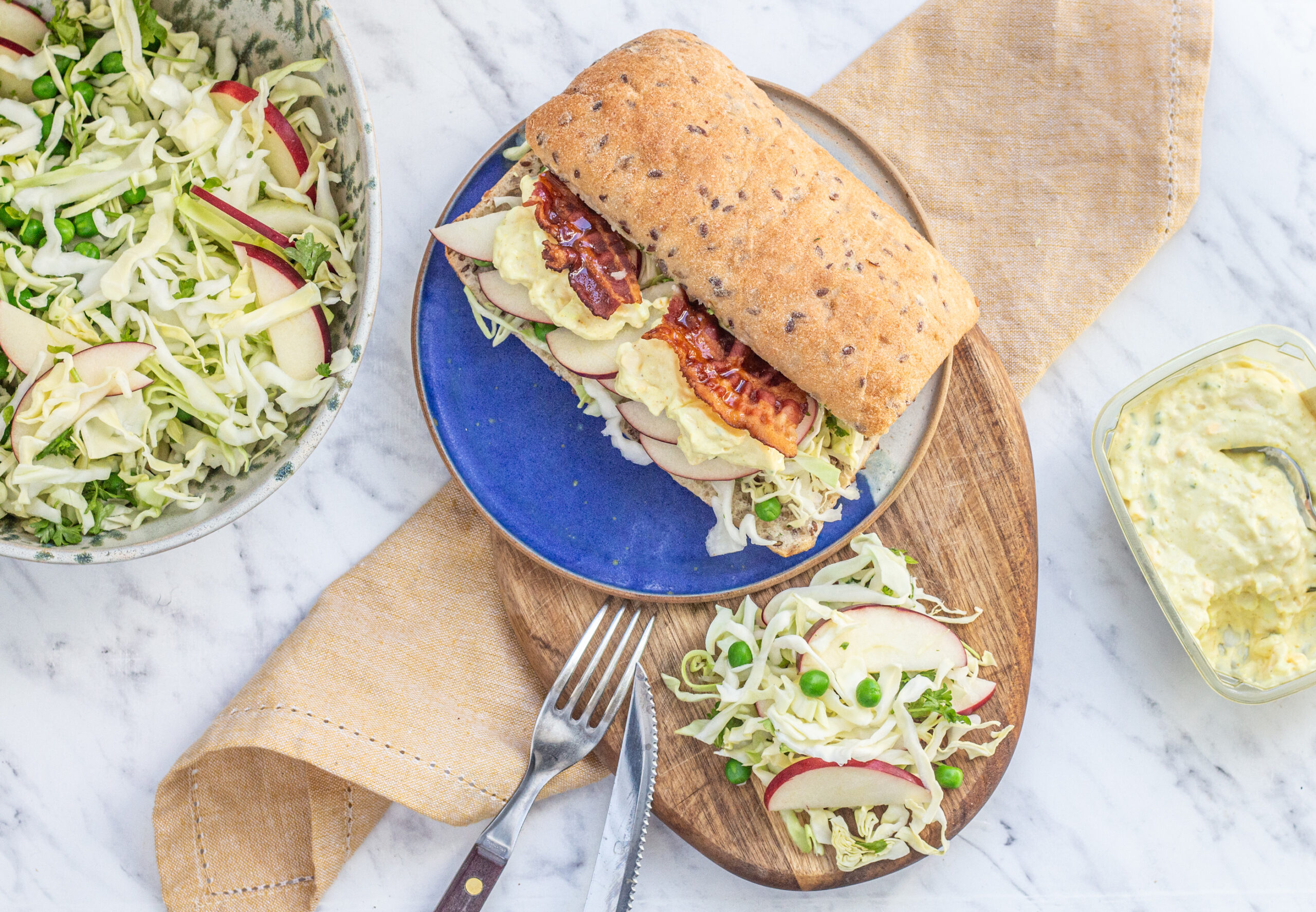 Lynhurtig sandwich fyldt med æggesalat og sprøde baconstykker og serveret med en sprød salat med æbler og ærter. God fornøjelse!