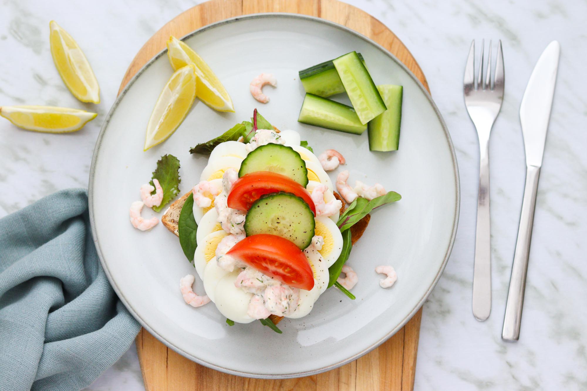 Sprød toast toppet med kogt æg og cremet, hjemmelavet rejesalat – en supernem og lækker klassiker. Serveres med frisk salat, tomat og agurk. God fornøjelse!
