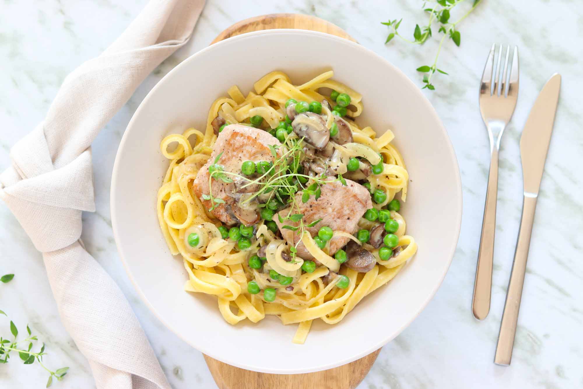 Her serverer vi en lækker pastaret med stegte svinemørbradbøffer i en cremet flødesovs med løg, champignoner, ærter og timian. God fornøjelse!
