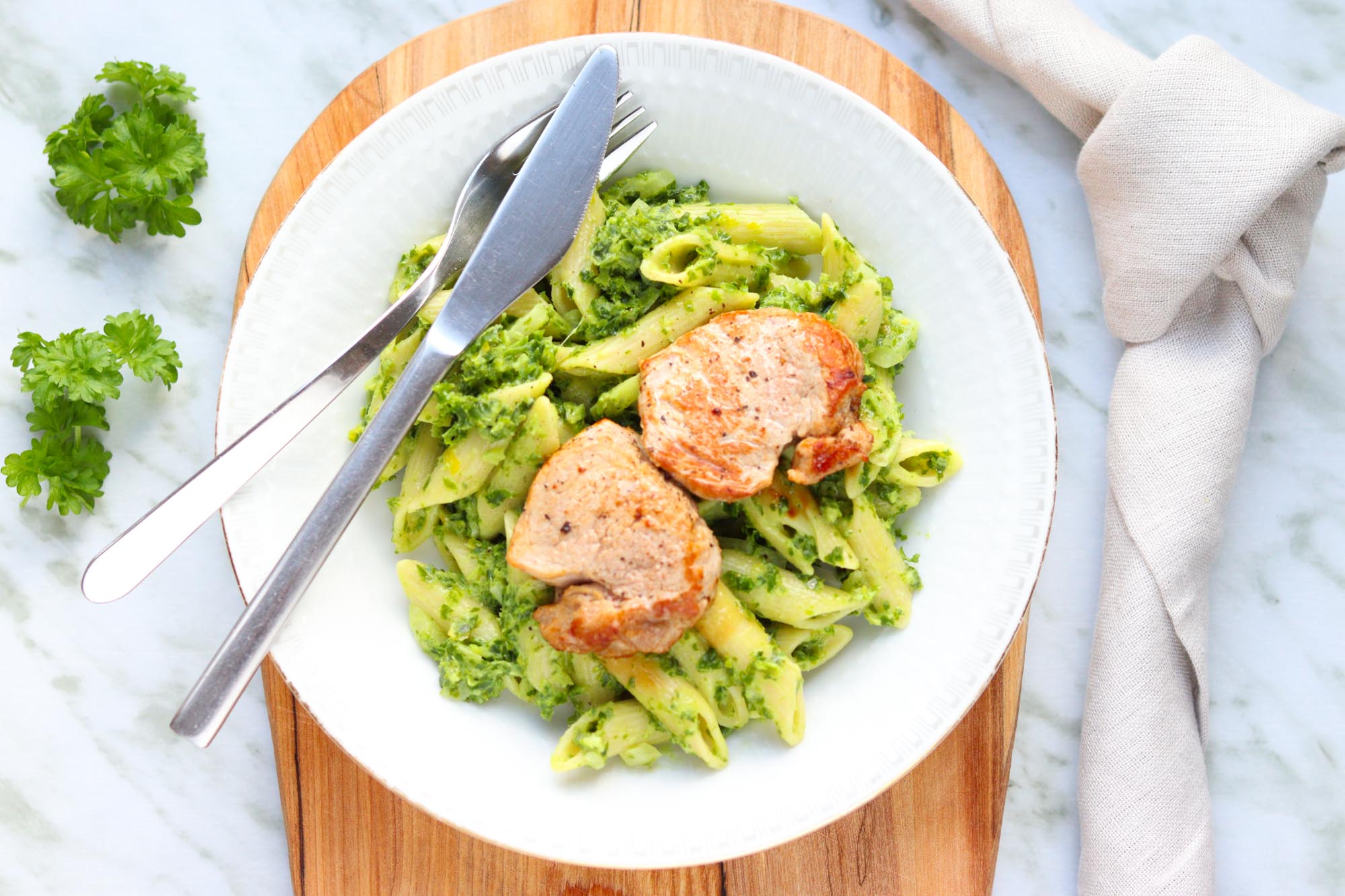 6. Vend pastaen sammen med den cremede grønkålssauce og server den sammen med mørbradbøfferne. Velbekomme!