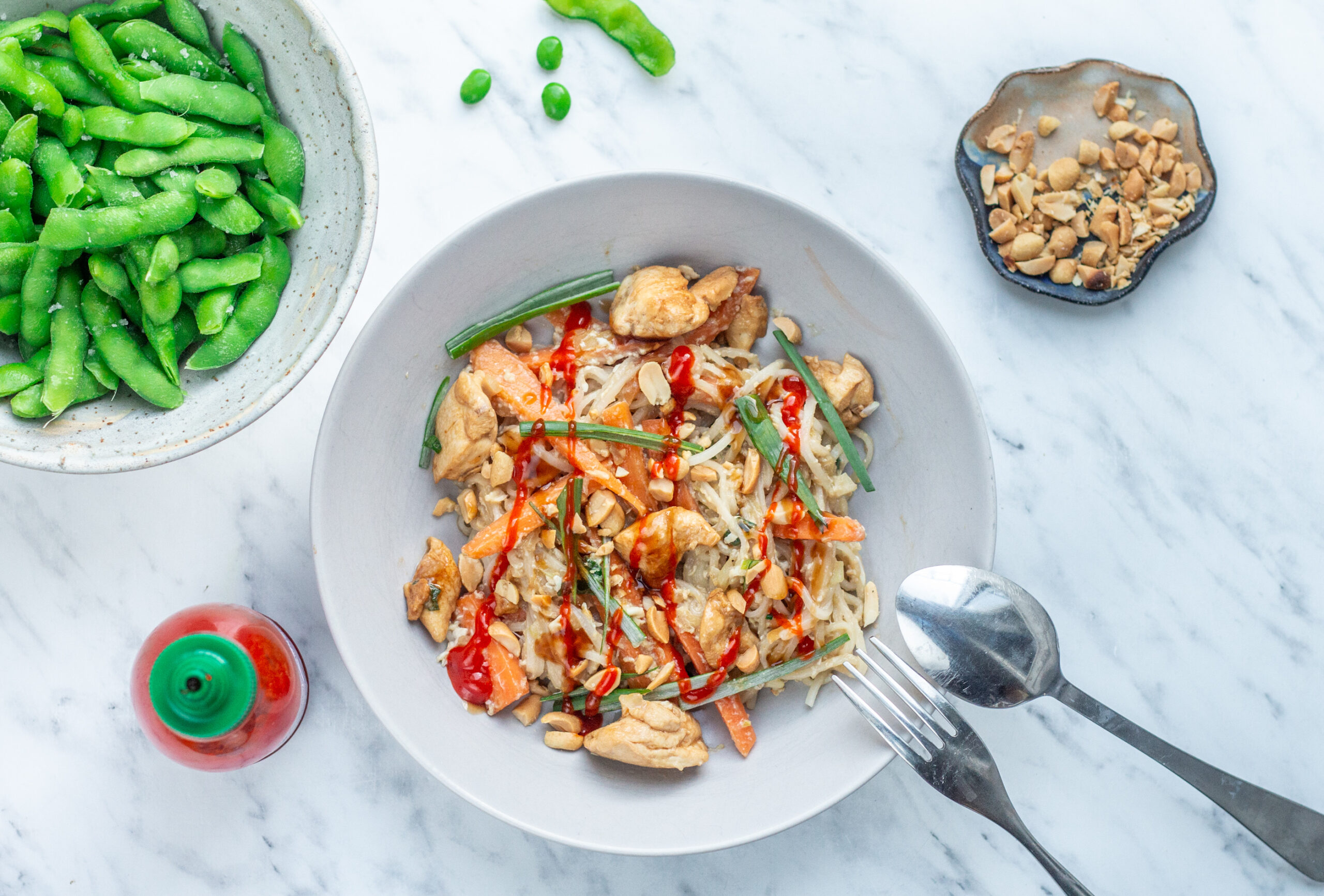 Klassisk thailandsk pad thai med kylling, gulerødder og nudler. Stegt med æg og serveret med saltede edamamebønner. God fornøjelse!