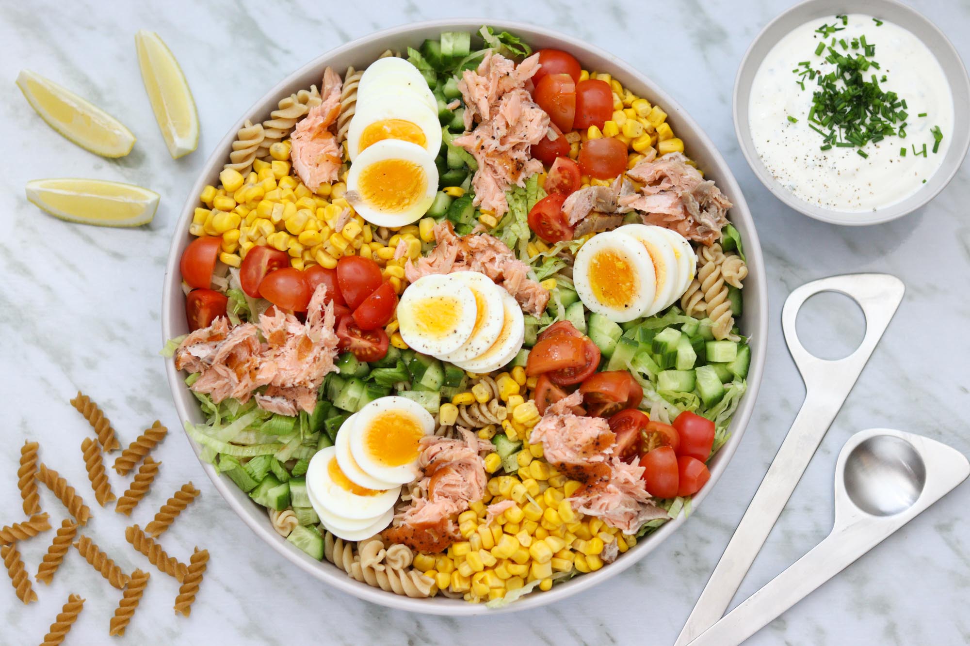 En lækker og fyldig pastasalat med varmrøget ørred, kogte æg, agurk, tomat, majs og icebergsalat. Pastasalaten serveres med en simpel purløgsdressing som tilbehør. God fornøjelse!