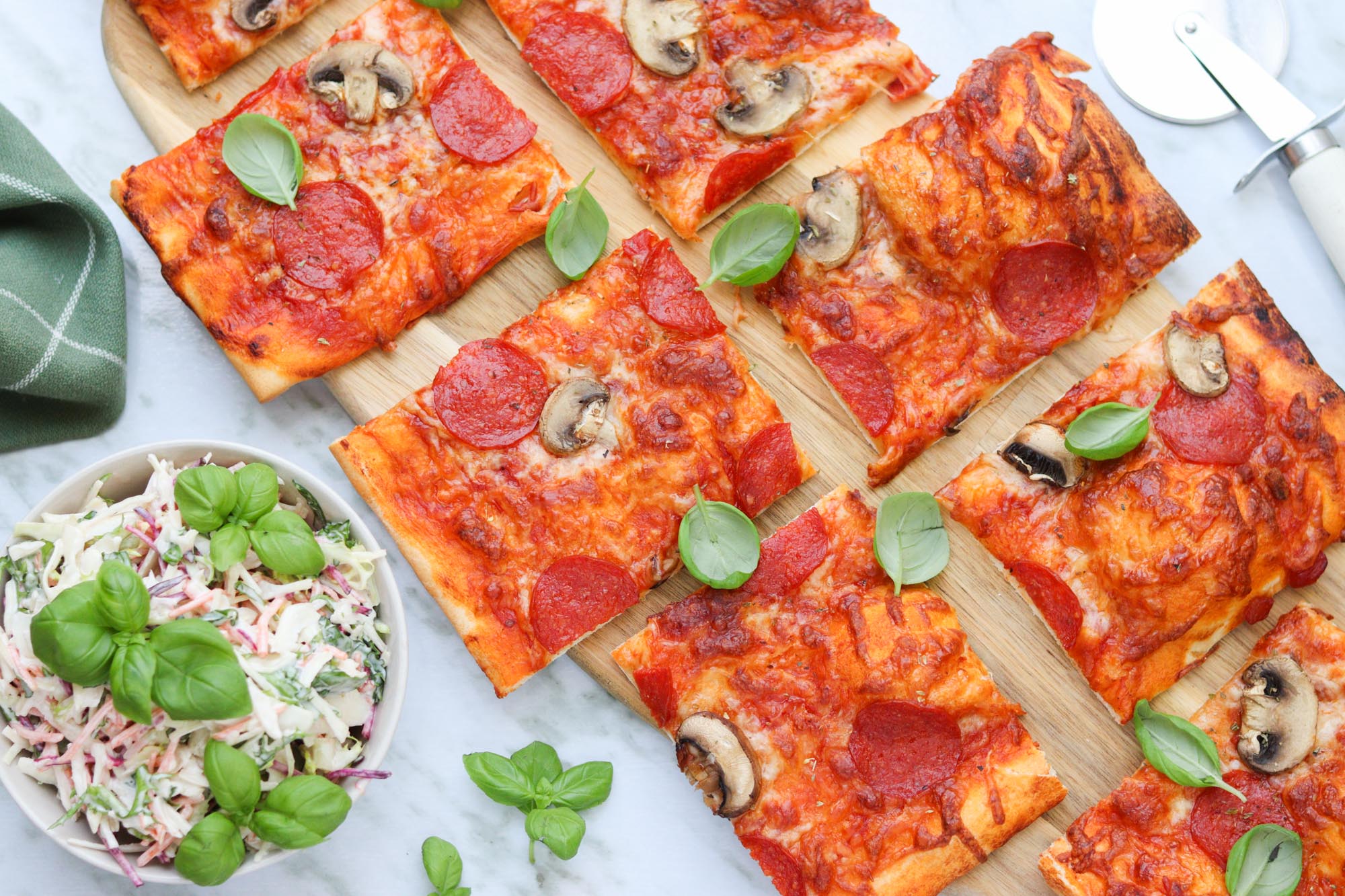 En nem og lækker pizza med tomatsauce, pepperoni, champignoner og revet ost på toppen. Serveret med en hurtig færdigsnittet salat. God fornøjelse!