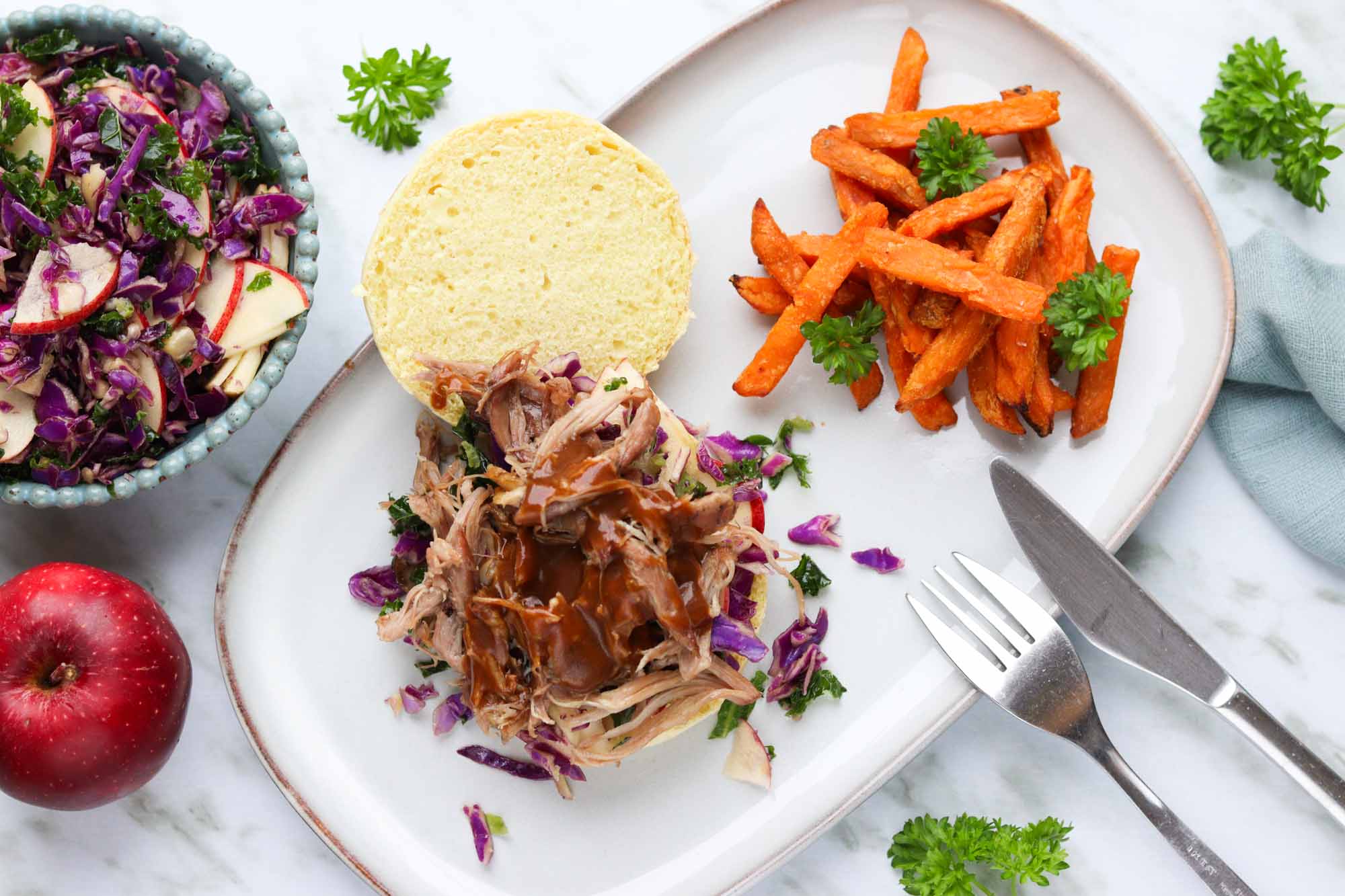 7 Stil alle ingredienserne på bordet og lad hele familien sammensætte deres egen saftige pulled duck burger med sweet potato fritter som tilbehør. Velbekomme!
