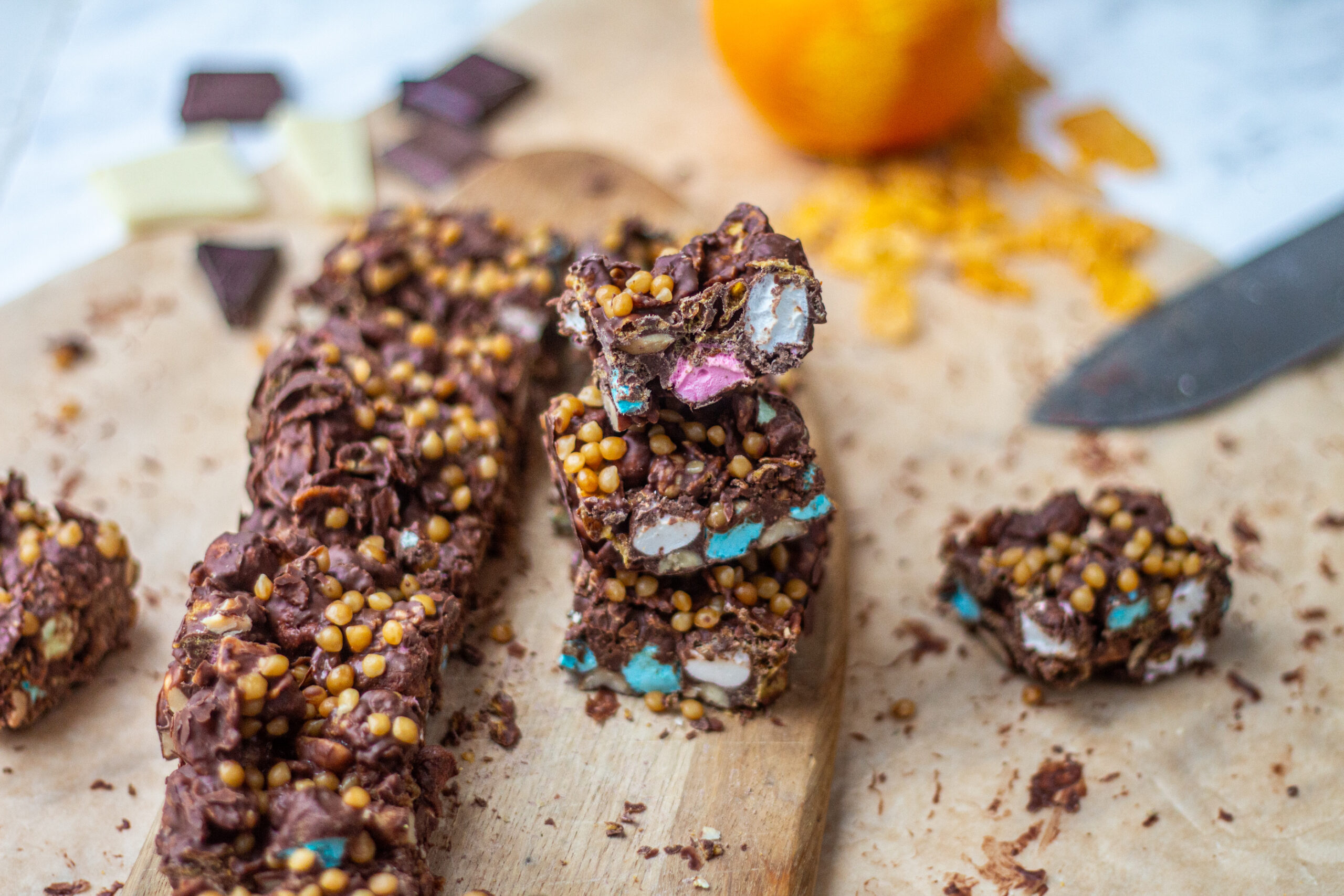 Rocky Road chokoladebarer er nemme chokoladebarer, der ikke skal bages. De er perfekte som nem og hurtig julekonfekt fyldt med dit yndlingsknas. Her har vi brugt marshmallows, peanuts, cornflakes og fintrevet appelsinskal. God fornøjelse!