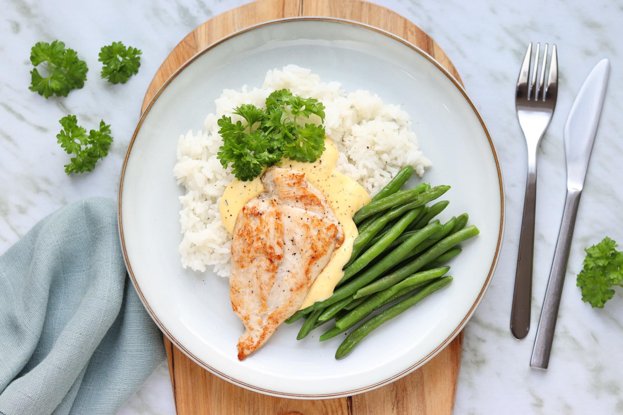 Her serverer vi en ultranem og lækker ret med saftige kyllingefileter serveret med ris, bønner og en færdiglavet bearnaisesauce. Hvis du har lyst til at kaste dig ud i den hjemmelavede bearnaise, skal du blot trykke på kokkehuen i ingredienslisten, så får du opskriften. God fornøjelse!