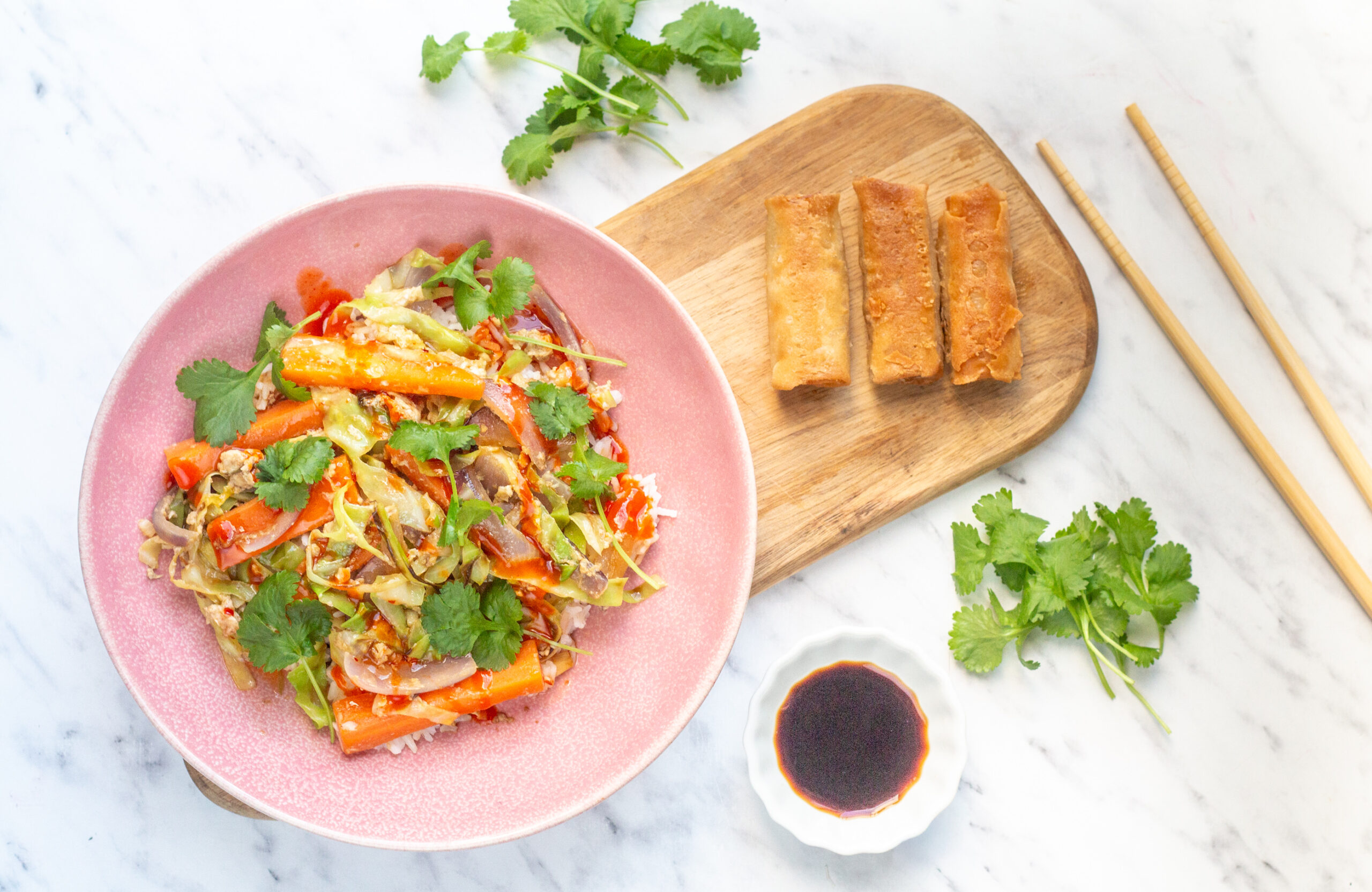 Mums! Små sprøde forårsruller der serveres med ris og stegte grøntsager vendt med æg, soya og sød chilisauce. God fornøjelse!