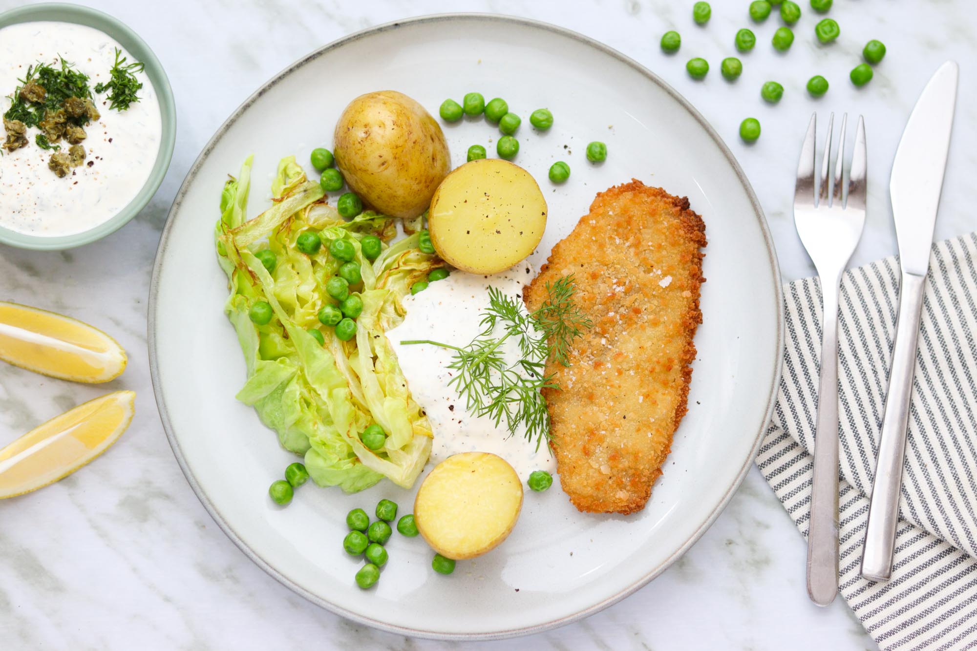 Sprøde fiskefileter serveret med kogte kartofler, ærter, pandestegt spidskål og en lækker urtedressing med dild, kapers og citron som tilbehør. God fornøjelse!