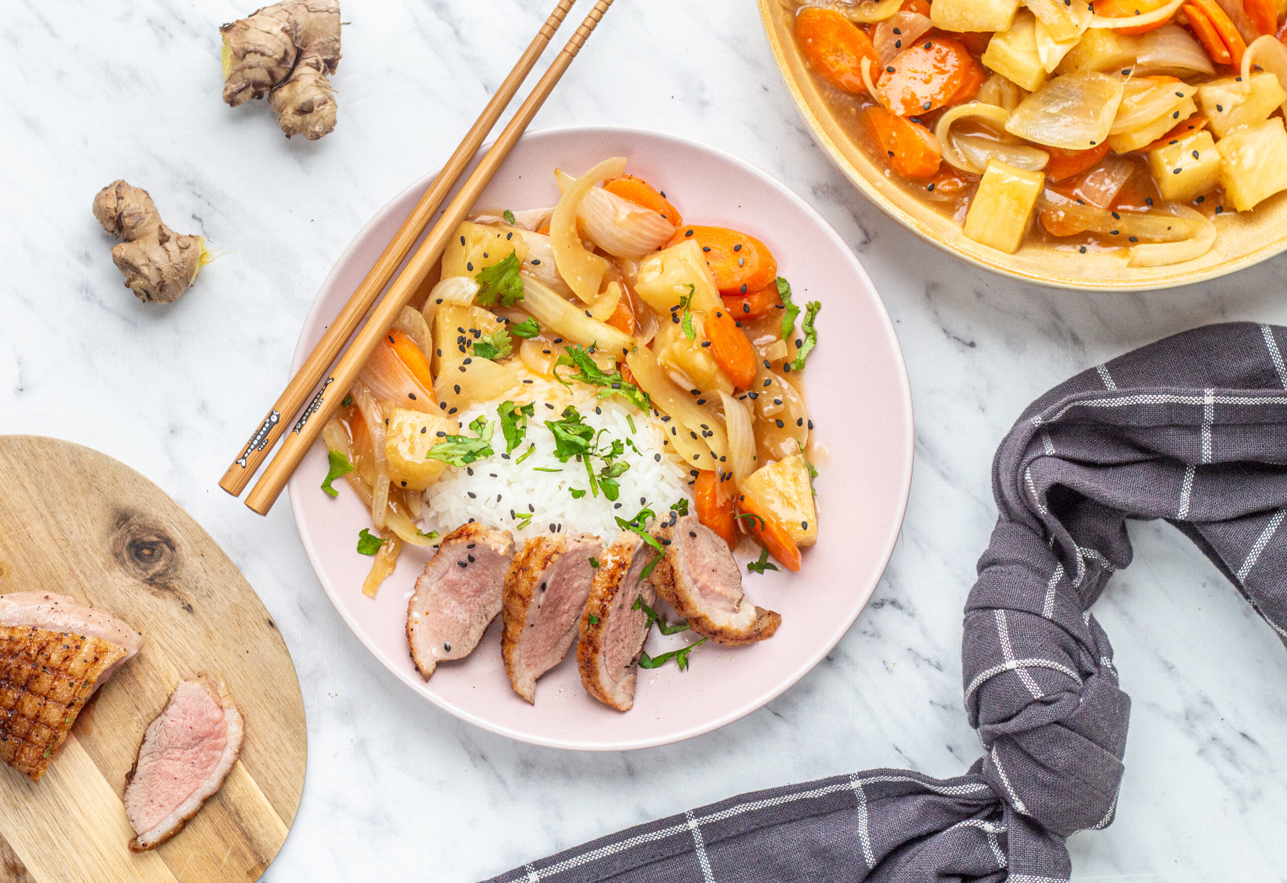 Sprødstegt andebryst skåret i skiver og serveret med gulerødder, ananas og ingefær i sursødsauce. Hertil serverer vi dampende varme ris. God fornøjelse!